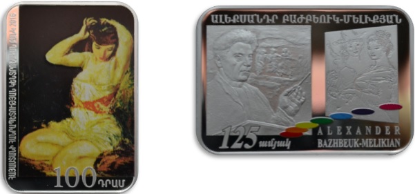Հուշադրամի դարձերեսին պատկերված են Ա.Բաժբեուկ-Մելիքյանի «Ինքնադիմանկար» և «Կանայք» կտավները: