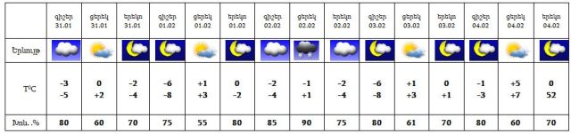 Հունվարի 31-ին, փետրվարի 1-ին, 4-ին սպասվում է առանց տեղումների եղանակ, փետրվարի 2-ին առավելապես արևմտյան շրջաններում սպասվում է ձյուն: