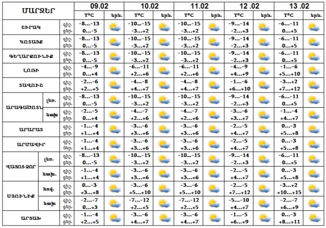 Երևանում Փետրվարի 9-13-ը սպասվում է առանց տեղումների եղանակ: