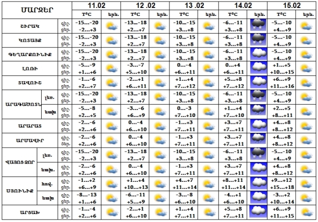 Փետրվարի 11-13-ին, 15-ին սպասվում է առանց տեղումների եղանակ, 14-ին առանձին շրջաններում հնարավոր են թույլ տեղումներ: