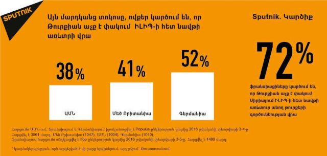 «Sputnik.Կարծիք» հարցման տվյալների համաձայն` ֆրանսիացիների 72%-ը կարծում է, որ Թուրքիան աչք է փակում Սիրիայում ԻԼԻՊ-ի հետ նավթի առևտուր անող թուրքերի գործունեության վրա: Գերմանացիների կեսից ավելին (52%), ամերիկացիների 38%-ը և անգլիացիների 41%-ը համաձայն է, որ ահաբեկիչների հետ նավթիվաճառքը թուրքական իշխանության թույլտվությամբ է իրականացվում:
