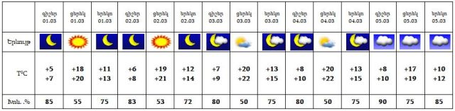 Մարտի 1-4-ը սպասվում է առանց տեղումների եղանակ, 5-ին առանձին շրջաններում սպասվում է անձրև: Քամին՝ արևմտյան` 2-7 մ/վրկ արագությամբ: