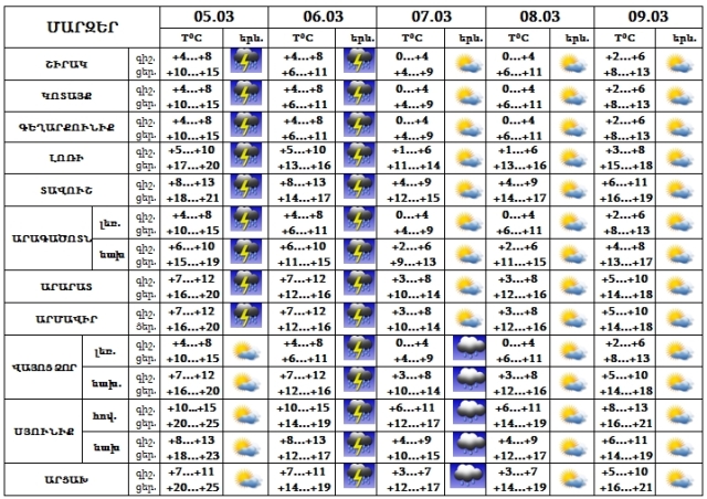 Մարտի 5-6-ը, 7-ի գիշերը սպասվում է անձրև և ամպրոպ, 7-ի ցերեկը, 8-9-ը սպասվում է առանց տեղումների եղանակ: Ամպրոպի ժամանակ հնարավոր է քամու ուժգնացում՝ 15-18 մ/վրկ: