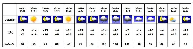 Մարտի 9-10-ին, 11-ի գիշերը, 13-ին սպասվում է առավելապես առանց տեղումների եղանակ, 11-ի ցերեկը, 12-ին սպասվում է անձրև: