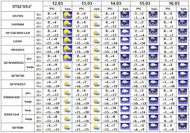 Մարտի 12-ի օրվա երկրորդ կեսին և 13-ի գիշերը առավելապես հյուսիսային շրջաններում սպասվում են կարճատև անձրևներ, 14-ի երեկոյան ժամերին, 15-16-ը շրջանների զգալի մասում ժամանակ առ ժամանակ սպասվում են տեղումներ, լեռնային շրջաններում՝ ձյուն: