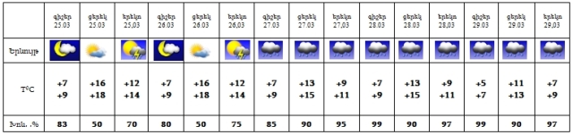 Մարտի 25-26-ը օրվա երկրորդ կեսին հնարավոր է կարճատև անձրև և ամպրոպ, 27-29-ը ժամանակ առ ժամանակ սպասվում է անձրև: 25-ին հնարավոր է քամու ուժգնացում‵ 18-20 մ/վրկ: