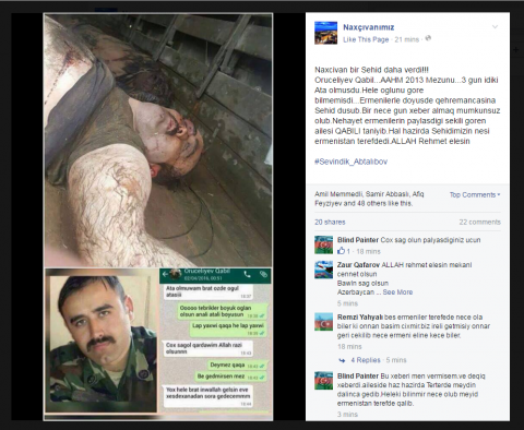 «razm.info»–ի փոխանցմամբ՝ ապրիլի 6-ին «Ֆեյսբուքում» ադրբեջանցի օգտատերերից մեկը հայտնել է, որ ապրիլի առաջին օրերի մարտերում ադրբեջանցիների թողած դիակներից մեկի լուսանկարից ճանաչել է անհետ կորած համարվող իր հարազատին` լեյտենանտ Գեբիլ Օրուջելիևին: Սպանված սպան ևս Նախիջևանի բնակիչ էր: