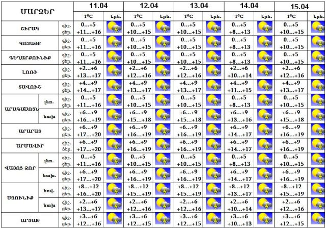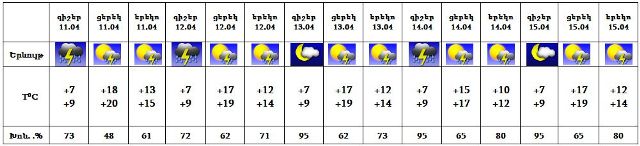 Ապրիլի 11-15-ին՝ ժամանակ առ ժամանակ, սպասվում են կարճատև անձրև և ամպրոպ: