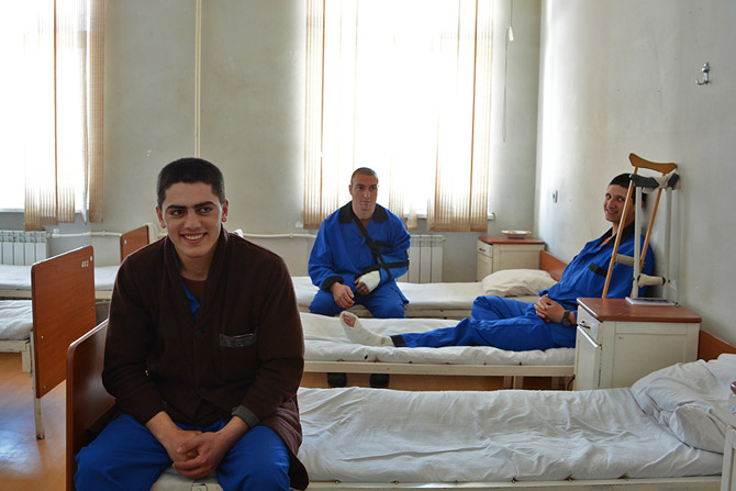 Հիվանդասենյակի մահճակալների մեծ մասի մոտ հենակներ են պատին դեմ տված։ Վնասվածքաբանական բաժանմունքում հիմնականում արկերի բեկորներից տուժածներն են։ Անկախ վնասվածքի լրջությունից՝ լայն ժպիտն ու հումորն անպակաս է նրանցից։ Երբ փորձում ես բան հարցնել, մեկը մյուսին առաջ տալով, ասում է՝ թող Անդոն պատմի, Անդոն էլ թե՝ թող Մարտինը պատմի։
