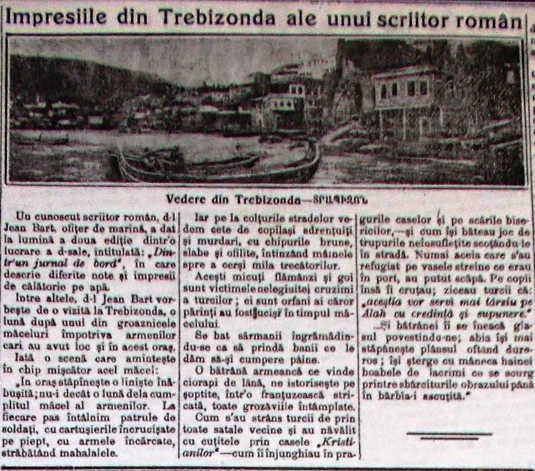 «Հայերի սարսափելի սպանությունների» մասին իր տպավորություններն է հաղորդել Սուչավայում ծնված գրող Ժան Բարտը, հետագայում Ռումինական ակադեմիայի թղթակից անդամ: Բարտը 1915թ. եղել է Տրապիզոնում և հավաքել է հրաշքով փրկված հայերի հուշերը: Տարեց մի հայուհի, ջարդված ֆրանսերենով պատմել է, որ թուրքերը խնայել են իր երեխաներին այն մտքով, որ վերջիններս «հետագայում Ալլահին կծառայեն հավատքով ու հնազանդությամբ»: