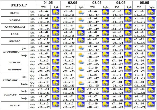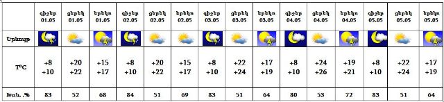 Մայիսի 1-ին, 3-5-ին առավելապես օրվա երկրորդ կեսին և գիշերվա առաջին կեսին շրջանների մեծ մասում, 2-ին‵ Լոռիում, Տավուշում, Սունիքում և Արցախում սպասվում են կարճատև անձրև և ամպրոպ, առանձին հատվածներում հնարավոր է կարկուտ: Քամին՝ հարավարևմտյան‵ 2-7 մ/վրկ արագությամբ, ամպրոպի ժամանակ հնարավոր է քամու ուժգնացում‵ 15-20 մ/վրկ: Օդի ջերմաստիճանը 30-2-ին էապես չի փոխվի, 3-4-ի ցերեկը կբարձրանա 2-4 աստիճանով: