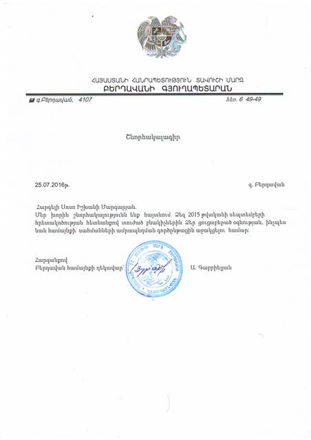Ինձ նաև սա են ուղարկել. սա Բերդավանի գյուղապետի շնորհակալագիրն է՝ կատարված աշխատանքի համար: Բայց, ի հեճուկս սահմանամերձ գյուղերից ցուցաբերած աջակցության, ի հեճուկս կատարված այլ գործերի, որոնց մասին ես դեռ չեմ խոսի, Սերժ Սարգսյանի իշխանության օրոք այս տղան արժանացավ կալանքի: Սա՛ է Սերժ Սարգսյանի իշխանության ողջ էությունը՝ չօգնել սահմանամերձ գյուղերին, չսիրել սեփական ժողորդին, պատժել բոլոր նրանց, ովքեր սիրում են իրենց հայրենիքը և փորձում հայրենիքի համար մի դրական բան անել: Ես կփորձեմ կապվել այլ տուժածների հարազատների հետ և իրենցից նույնպես տեղեկություն ստանալ և հրապարակել դրանք: Կոչ եմ անում նաև ձեզ՝ իմ ընկերներին և ազնիվ ու սրտացավ բոլոր մարդկանց, դուք էլ անտարբեր մի եղեք. ցույց տանք, որ այդ տղաները հանցագործ խուլիգաններ չեն, ինչպես մեզ են փորձում համոզել: