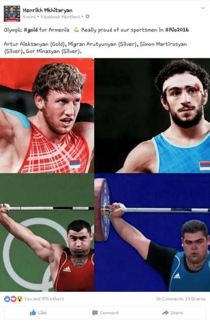 Ֆուտբոլիստներ Հենրիխ Մխիթարյանը և Յուրա Մովսիսյանը ֆեյսբուքյան իրենց էջերում անդրադարձել են Ռիոյում հայ մարզիկների հաղթանակներին։