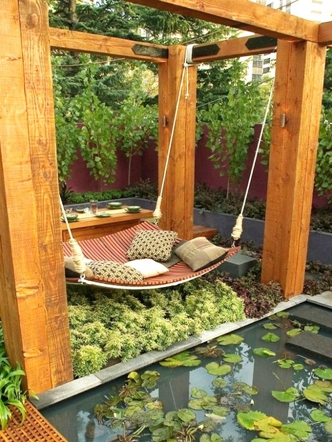 Հարմարավետ ցանցաճոճ արհեստական լճակի մոտ