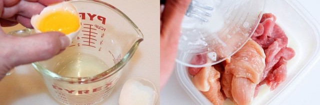 Թաթախեք մսի կտորներ եգիպտացորենի կրախմալից և ձվի դեղնուցից պատրաստված խառնուրդի մեջ