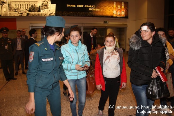 Օդանավակայանում տուժածներին դիմավորելու էին եկել ՀՀ Տրանսպորտի, կապի և տեղեկատվական տեխնոլոգիաների նախարար Վահան Մարտիրոսյանը, ՀՀ ԱԻՆ փրկարար ծառայության տնօրենի տեղակալ, փ/ծ գեներալ-մայոր Նիկոլայ Գրիգորյանը, ՀՀ ԱԻՆ Փրկարար ծառայության տնօրենի տեղակալ, փ/ծ գնդապետ Արման Ցոլակյանը, ինչպես նաև արտակարգ իրավիճակների, տրանսպորտի, կապի և տեղեկատվական տեխնոլոգիաների, առողջապահության նախարարության մի շարք աշխատակիցներ: