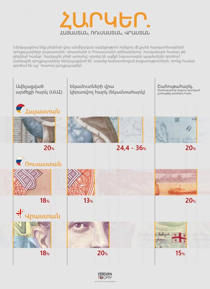 Զգո՞ւմ եք՝ մեր իշխանություններին պարզ և հասարակ ճշմարտությունները բացատրելն ինչ դժվար է։ Կամ էլ դժվար չէ, և իրենք պետական կառավարումն իրականացնելիս առաջնորդվում են այլ շահերով։ Խոսում են Հայաստանը ներդրողների համար գրավիչ դարձնելու մասին, ասում են՝ հեսա-հեսա փեշով ներդրում են բերելու, բայց մուրացկանությունից՝ բացի այլ բան չեն անում։ Գնում Ամերիկաներում ու Եվրոպաներում լացում են, թե բա՝ մեզ մի քիչ փող տվեք։ Սրտացավ մարդիկ էլ տալիս են․․․բայց տարեցտարի ավելի քիչ են տալիս։ Իսկ ուղիղ ներդրումներ չեն գալիս։ Իսկ ինչի՞ պետք է գան։ Մեր հարկերը տեսե՞լ եք։ Շատ հետաքրքիր համեմատություն է։ Ներդրումներին խոչընդոտող մի շարք կարևոր հանգամանքներ կան՝ կոռուպցիա, ենթակառուցվածքների բացակայություն, հարկերի չափ։ Հայաստանում ու Ռուսաստանում կոռուպցիան պետական քաղաքականության մաս է կազմում, Վրաստանը դրանով առաջ է անցել մեզանից։ Ենթակառուցվածքների առումով զիջում ենք, քանի տարի է՝ մի Հյուսիս-հարավ մայրուղի չենք կարողանում կառուցել։ Բայց, փաստորեն, հարկերով էլ այնպես ենք խեղդում գործարարներին, որ ոչ միայն նոր ներդրողները Հայաստանի կողմ չեն նայի, այլ եղածներն էլ այստեղից կփախչեն նույն այդ Ռուսաստան ու Վրաստան, որտեղ հա՛մ հարկերն են ավելի քիչ, համ էլ շուկան՝ ավելի մեծ։ Հիմա էլ ԵՏՄ ենք մտել, և կապիտալի տեղաշարժն ավելի է հեշտացել։ Իսկ մեր իշխանություններն ամեն ինչ անում են, որ գործարարներն այստեղ չկան։ Իսկ Հայաստանն իր հարկային քաղաքականության շնորհիվ կարող էր մրցել Ռուսաստանի, Ղազախստանի և նույն այդ Վրաստանի հետ, որի համար կարող էր իսկապես մուտք լինել ԵՏՄ շուկա։ Դրա համար պետք էր ընդամենը հարկերի դրույքաչափերը նվազեցնել, և շատ գործարարներ կգային ու Հայաստանում ռեզիդենտ կդառնային՝ ավելի պակաս հարկեր վճարելու համար։ Իսկ մերոնք գնացել են ամենապարզունակ ճանապարհով՝ մինչև վերջ փորձում են սեփական գործարարներին քերթել՝ դրանով հոգալով պետության և իրենց անձնական ծախսերը: