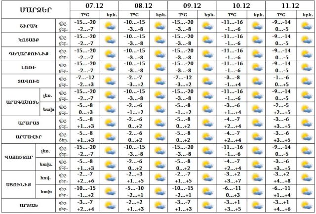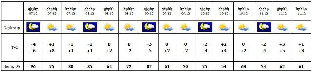 Դեկտեմբերի 7-11-ը սպասվում է առավելապես առանց տեղումների եղանակ: Առավոտյան ժամերին առանձին վայրերում հնարավոր է մառախուղ:
