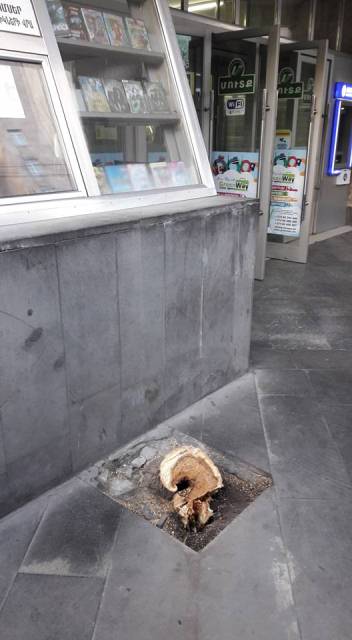 Տեսնես՝ ո՞ւմ էր խանգարում խեղճ, անպաշտպան ծառը... մետրոյի աշխատակցին հարցնում եմ` տեղյա՞կ եք՝ ինչու են ծառը կտրել, ասում է՝ հենց նոր ձեզանից եմ լսում... ծառի` այնտեղ չլինելն անհնարին էր չնկատել, մի տեսակ դատարկություն է... կամ շատ անտարբեր են իրենց աշխատավայրի տարածքի, քաղաքի նկատմամբ, կամ էլ...