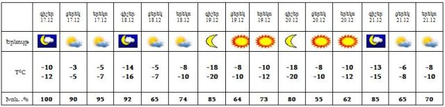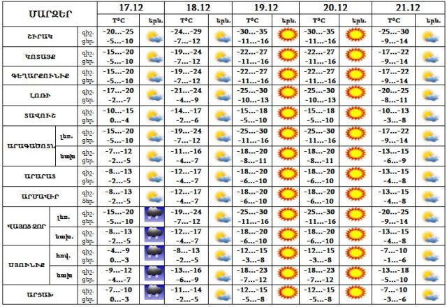 Դեկտեմբերի 17-ին Վայոց ձորում, Սյունիքում և Արցախում սպասվում է թույլ ձյուն: 18-21-ը սպասվում է առանց տեղումների եղանակ: