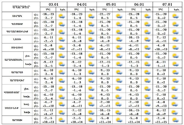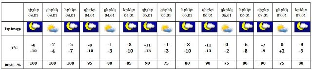 Հունվարի 3 - 7-ը սպասվում է առանց տեղումների եղանակ: