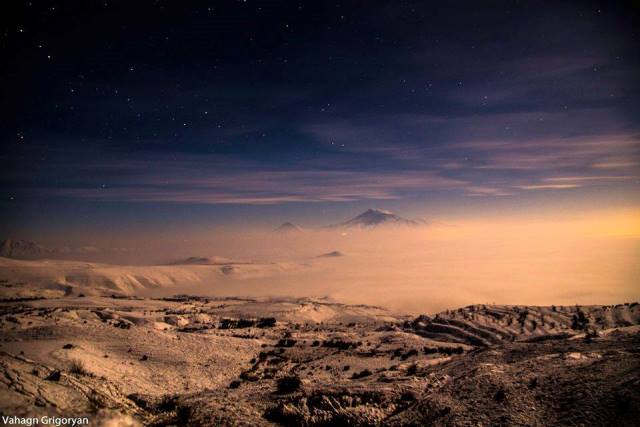 Արարատ լեռը՝ Ողջաբերդից (Չարենցի կամար), ներքևում երևում է լճի տպավորություն թողնող Արարատյան դաշտը: Լուսանկարը՝ Vahagn Grigoryan