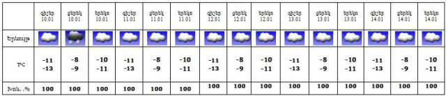 Հունվարի 10-ին սպասվում է թույլ ձյուն: 11-14-ը սպասվում են ամպամածություն, գիշերը և առավոտյան` նաև մառախուղ։