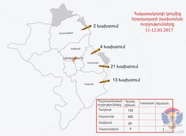 Մարտի 11-ին և լույս 12-ի գիշերը արցախա-ադրբեջանական հակամարտ զորքերի շփման գծում հակառակորդը տարբեր տրամաչափի հրաձգային զինատեսակներից հրադադարի պահպանման ռեժիմը խախտել է 40 անգամ՝ հայ դիրքապահների ուղղությամբ արձակելով շուրջ 500 կրակոց: Շփման գծի արևելյան և հյուսիսարևելյան ուղղություններում ադրբեջանական զինուժը կիրառել է նաև 60-միլիմետրանոց ականանետ (2 արկ):