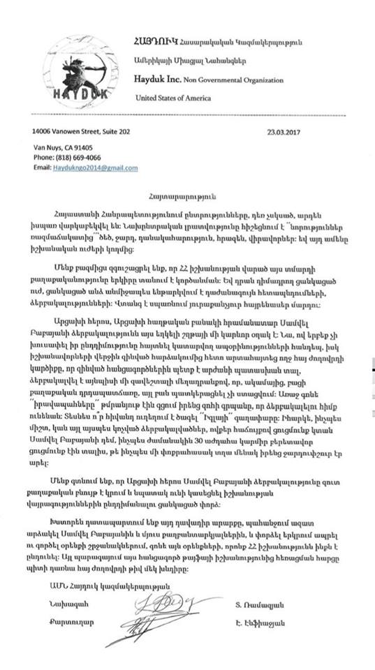Ամերիկայի Միացյալ Նահանգներում գործող ազատամարտիկների «Հայդուկ» հասարակական կազմակերպությունը, որը հիմնվել է Արցախյան պատերազմի մասնակիցների կողմից, հայտարարություն է տարածել ԼՂՀ ՊՆ և ՊԲ նախկին հրամանատար, գեներալ–լեյտենանտ, Արցախի հերոս Սամվել Բաբաբայի ձերբակալության առնչությամբ։