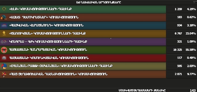 Քիչ առաջ ԿԸՀ-ն ներկայացրել է ԱԺ ընտրությունների նախնական արդյունքները` 143 տեղամասերից․