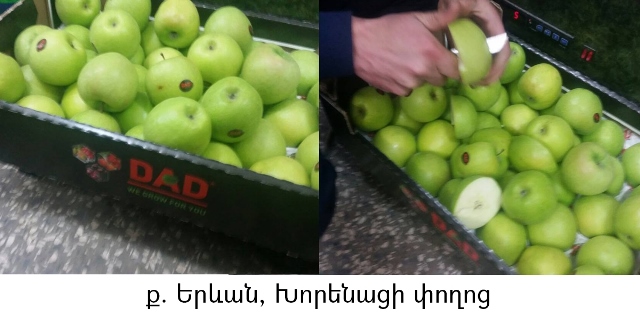 Խնձորի խմբաքանակներ են հայտնաբերվել Երևանի «Նոր Զովք» և «Ծիրան» սուպերմարկետների ցանցի մասնաճյուղերում և մի շարք այլ խանութներում, Հակոբ Հակոբյան փողոցի Մերգելյանի շուկայի տարածքում, ինչպես նաև անհատ ձեռնարկատերերի պատկանող միրգ-բանջարեղենի բազմաթիվ իրացման կետերում: Հայտնաբերված խմբաքանակներն ամբողջությամբ ոչնչացվել են: