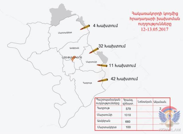 Մայիսի 12-ին և լույս 13-ի գիշերը արցախա-ադրբեջանական հակամարտ զորքերի շփման գծում հակառակորդը տարբեր տրամաչափի հրաձգային զինատեսակներից, հրադադարի պահպանման ռեժիմը խախտել է շուրջ 90 անգամ՝ հայ դիրքապահների ուղղությամբ արձակելով ավելի քան 2300 կրակոց: Բացի հրաձգային զինատեսակներից ադրբեջանական զինուժը շփման գծի հարավային ուղությամբ կիրառել է նաև 60 և 82 միլիմետրանոց ականանետեր (2 արկ):