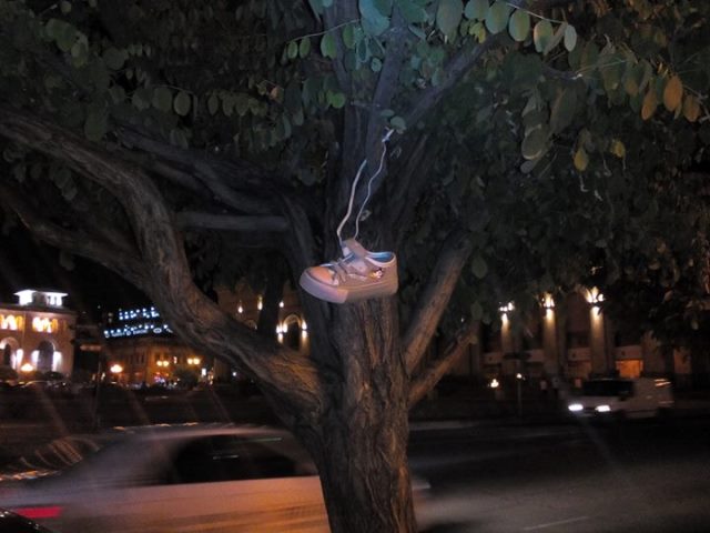 Օրվա կադր․ Երեխայի կոշիկ՝ հրապարակի ժամացույցի տակի ծառի վրա