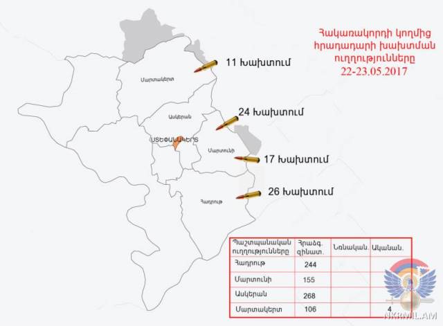 Մայիսի 21-ին և լույս 22-ի գիշերը արցախա-ադրբեջանական հակամարտ զորքերի շփման գծում հակառակորդը տարբեր տրամաչափի հրաձգային զինատեսակներից, հրադադարի պահպանման ռեժիմը խախտել է շուրջ 80 անգամ՝ հայ դիրքապահների ուղղությամբ արձակելով ավելի քան 750 կրակոց: Բացի հրաձգային զինատեսակներից, ադրբեջանական զինուժը շփման գծի հյուսիսային ուղղությամբ կիրառել է նաև 60 միլիմետրանոց ականանետ (4 արկ):