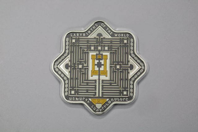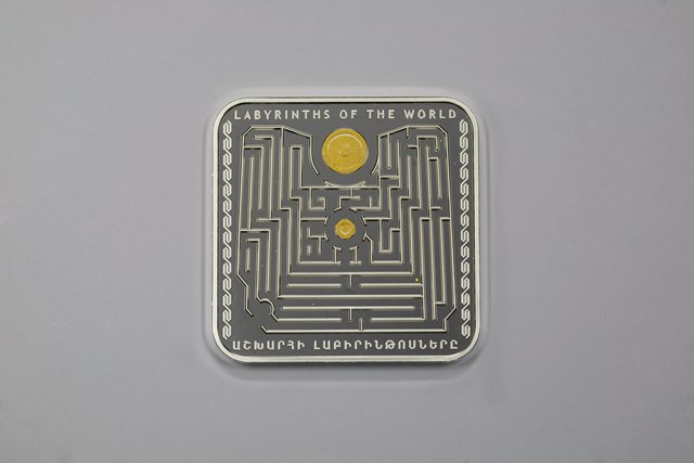 Դարձերես՝ Մազոնեի լաբիրինթոսի գծապատկերը՝ պարսպված հարթակը կենտրոնում, լաբիրինթոսի արահետներով գլորվող ոսկեզօծ գնդիկ: