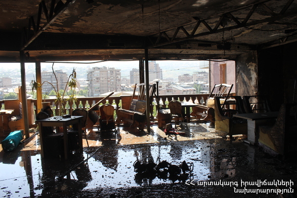 Այրվել են Հին Էրիվան պանդոկի 7-րդ հարկի բացօթյա սրճարանը (մոտ 20 քմ), վերելակի արտաքին երեսպատումը, գույքը, ջերմահարվել՝ կախովի առաստաղը և երկու հեռուստացույց: