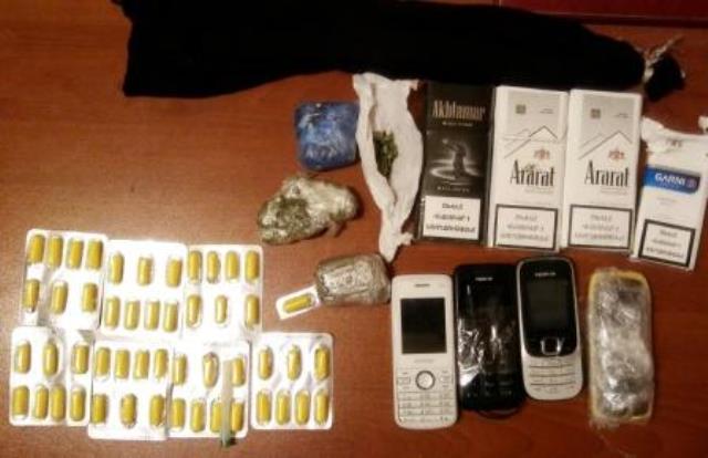 Հայտնաբերված փաթեթների մեջ առկա են եղել 174.8 գրամ ընդհանուր քաշով չորացված, մանրացված, կանաչադարչնագույն բուսական զանգված, 21.05 գրամ քաշով մուգ դարչնագույն կոշտ զանգված, 1.59 գրամ ընդհանուր քաշով 4 սպիտակ օվալաձև դեղահաբեր, մեկ հատ թափանցիկ հեղուկով լցված 5 միլիգրամանոց ներարկիչ, 4 հատ ներարկիչի ասեղ, 118 հատ «Պրեգաբալին» և 20 հատ «Լիրիկա» գրառմամբ դեղապարկուճներ, 17 բջջային հեռախոս, բջջային հեռախոսի 5 բաժանորդային քարտ, նույնքան ականջակալ, 2 «USB» մալուխ, բջջային հեռախոսի մեկ մարտկոց, 1 լիցքավորիչ և 1 Wi-Fi սարք: