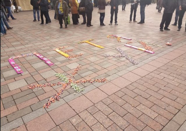 Կիևի կենտրոնում ակտիվիստները գրություն են թողել Ուկրաինայի նախագահ Պյոտր Պորոշենկոյի համար՝ նրա կողմից հիմնադրված Roshen ընկերության կոնֆետների և շոկոլադե սալիկների օգնությամբ։ Հրապարակի կենտրոնում ցուցարարները քաղցրավենիքով գրել են՝ «Պետյա, ծամի՛ր»։