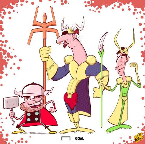 Ծաղրանկարում Մխիթարյանը պատկերվում է Marvel-ի հերոս, սկանդինավյան դիցաբանությունում խաբեության աստված Լոկիի կերպարում: Խուան Մատան հանդես է գալիս որպես Թորը, իսկ Զլատան Իբրահիմովիչը՝ Օդինը: