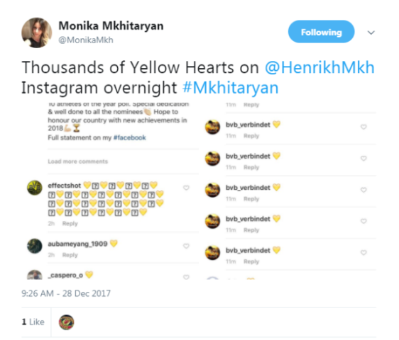 Դորտմունդյան թիմի երկրպագուների այս ակտիվության կողքով անտարբեր չի անցել նաև Մխիթարյանի քույրը` Մոնիկա Մխիթարյանը, ով «Instagram»-ում լուսանկարներ է հրապարակել երկրպագուների մեկնաբանություններից.