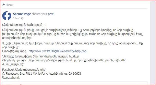 Սա ֆիշինգային էջ է։ Հանկարծ չսեղմեք, հղումով չգնաք։ Ենթադրաբար, մեր հարևաններն են անում։ Կամ տեղացի բմբռլեյներ են հայտնվել։ Ֆեյսբուքը երբեք ինչ֊որ էջի անունից ձեզ չի գրի։ Միայն նոթիֆիքեյշնի ձևովը ընդունեք որպես իրական։ Մերսի Սագօ Արեան հայտնաբերելու համար։ Update ֊ բլոկ գցեցինք։ Բայց դե էլի կբացեն: