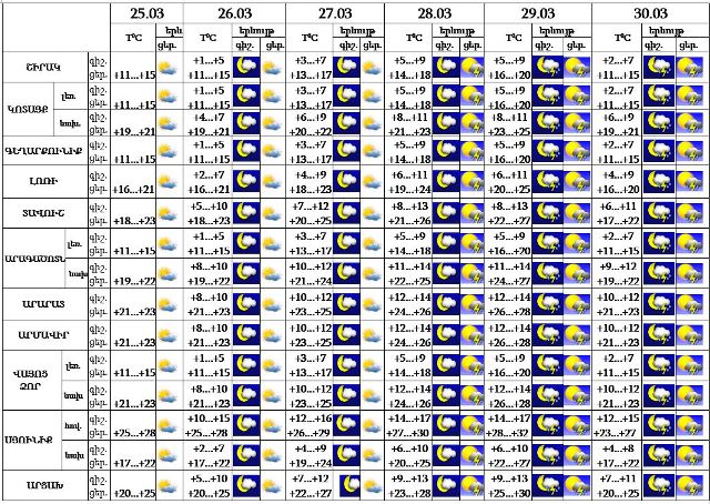Մարտի 28-ի երեկոյան, 29-30-ին սպասվում է կարճատև անձրև և ամպրոպ: Մարտի 25-27-ին, 28-ի գիշերը սպասվում է առանց տեղումների եղանակ: