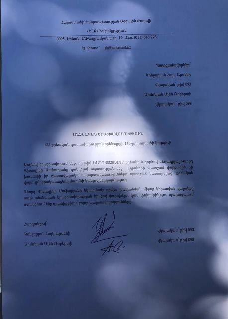 ԱԺ երկու պատգամավոր Գևորգ Սաֆարյանի նկատմամբ խափանման միջոցը փոխելու մասին երաշխավորություն են ներկայացրել (լուսանկար)