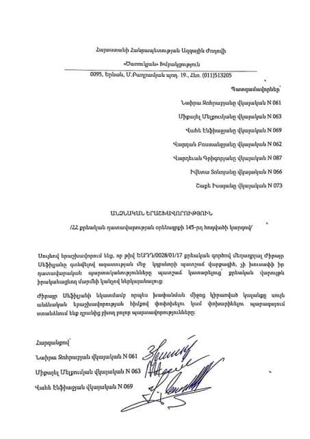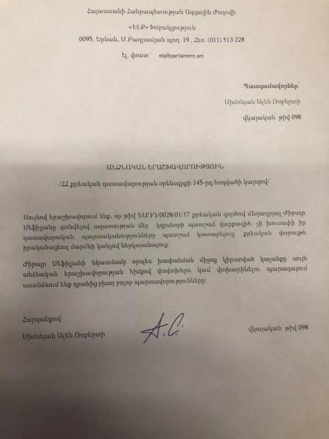 Երաշխավորագիր՝ Ժիրայր Սեֆիլյանի խափանման միջոցը փոխելու համար (լուսանկար)