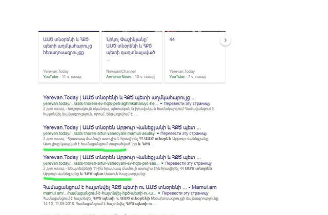 «Yerevan.Today-ի հարգելի այցելուներ, համացանցում տարածվել է տեղեկություն, թե իբր մեր կայքը 2 օր առաջ, տեղադրել եր ԱԱԾ և ՀՔԾ ղեկավարների հեռախոսազրույցը, իբրև թե նախօրոք իմանալով: Ցուցադրվում են ինչ-որ «ապացույցներ»: Համացանցային փորձագետներն արդեն հերքել են դա՝ նշելով, որ Google համակարգում առկա է խնդիր: Բայց միևնույն է՝ լայնորեն տարածվում է կեղծ տեղեկությունը, որը վերածվում է մեր կայքի դեմ լայն հակաքարոզչության: