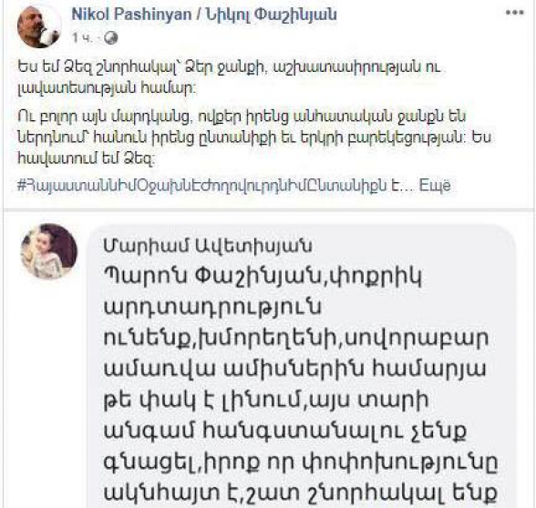 Վարչապետ Նիկոլ Փաշինյանը իր ֆեյսբուքյան էջում «Մարիամ Ավետիսյան» օգտատիրոջ գրառման «սքրինշոթ» է հրապարակել, որում, իբր, օգտատերը տեղեկացնում է, որ իրենց խմորեղենի արտադրամասն այս տարի լավ է աշխատել և շնորհակալություն է հայտնում Նիկոլ Փաշինյանին: