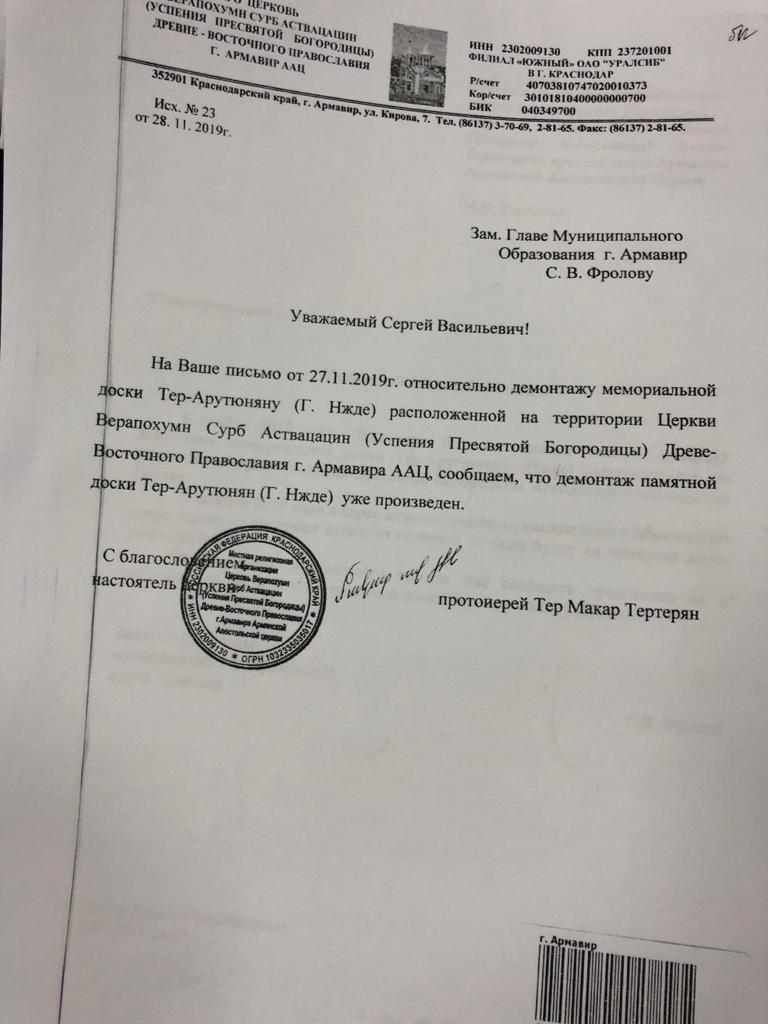 Հուշատախտակի ապամոնտաժման մասին վկայում է փաստաթուղթը, որը հայտնվել է Южная служба новостей պարբերականի ձեռքի տակ: Փաստաթղթում գրված է, որ հայկական եկեղեցու վերակացուն, ի պատասխան Արմավիրի փոխքաղաքապետի նամակին, տեղեկացնում է իրականացված ապամոնտաժման մասին: