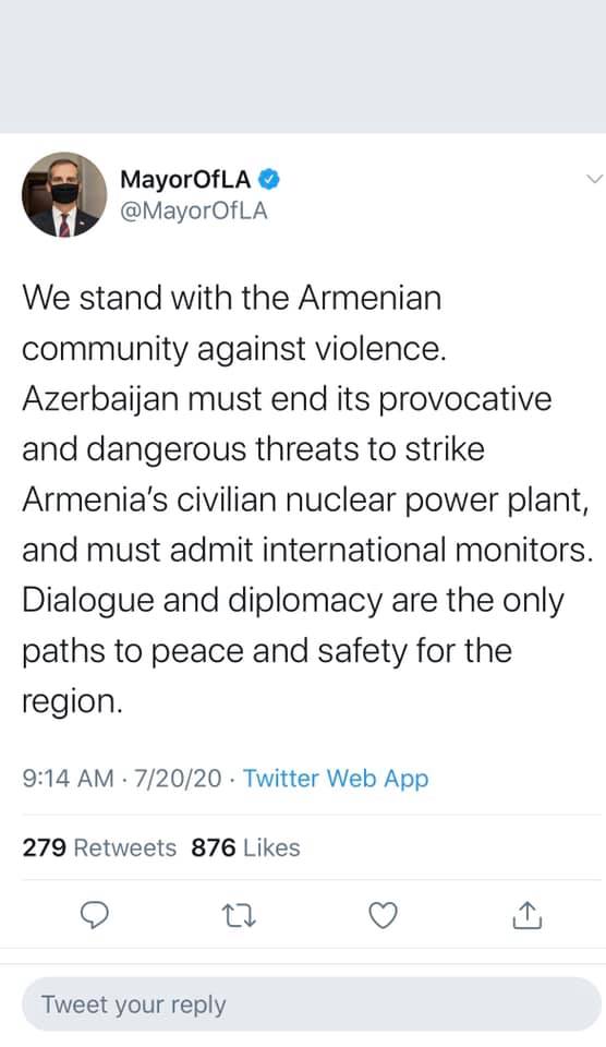 Կոչ ենք անում Ադրբեջանին դադարեցնել սադրիչ հայտարարությունները հայկական ատոմակայանի ռմբակոծման հետ կապված։ Թվիթերյան իր էջում նման հայտարարություն է արել Լոս Անջելեսի քաղաքապետ Էրիկ Գարեթսին: