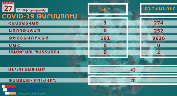 Առայսօր, նոր կորոնավիրուսային հիվանդությունը հաստատվել է 274 մարդու մոտ, որից 252-ը հաղթահարել է հիվանդությունը: Փաստացի բուժում է ստանում 20, ընդհանուր մեկուսացված է 43 քաղաքացի: