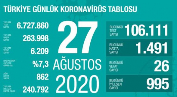 Թուրքիայում օգոստոսի 27-ին նոր տիպի կորոնավիրուսից (Covid-19) մահացել է 26 մարդ։ Այդ մասին «Twitter» միկրոբլոգի իր պաշտոնական էջում հայտնել է Թուրքիայի առողջապահության նախարար Ֆահրեթթին Քոջան։